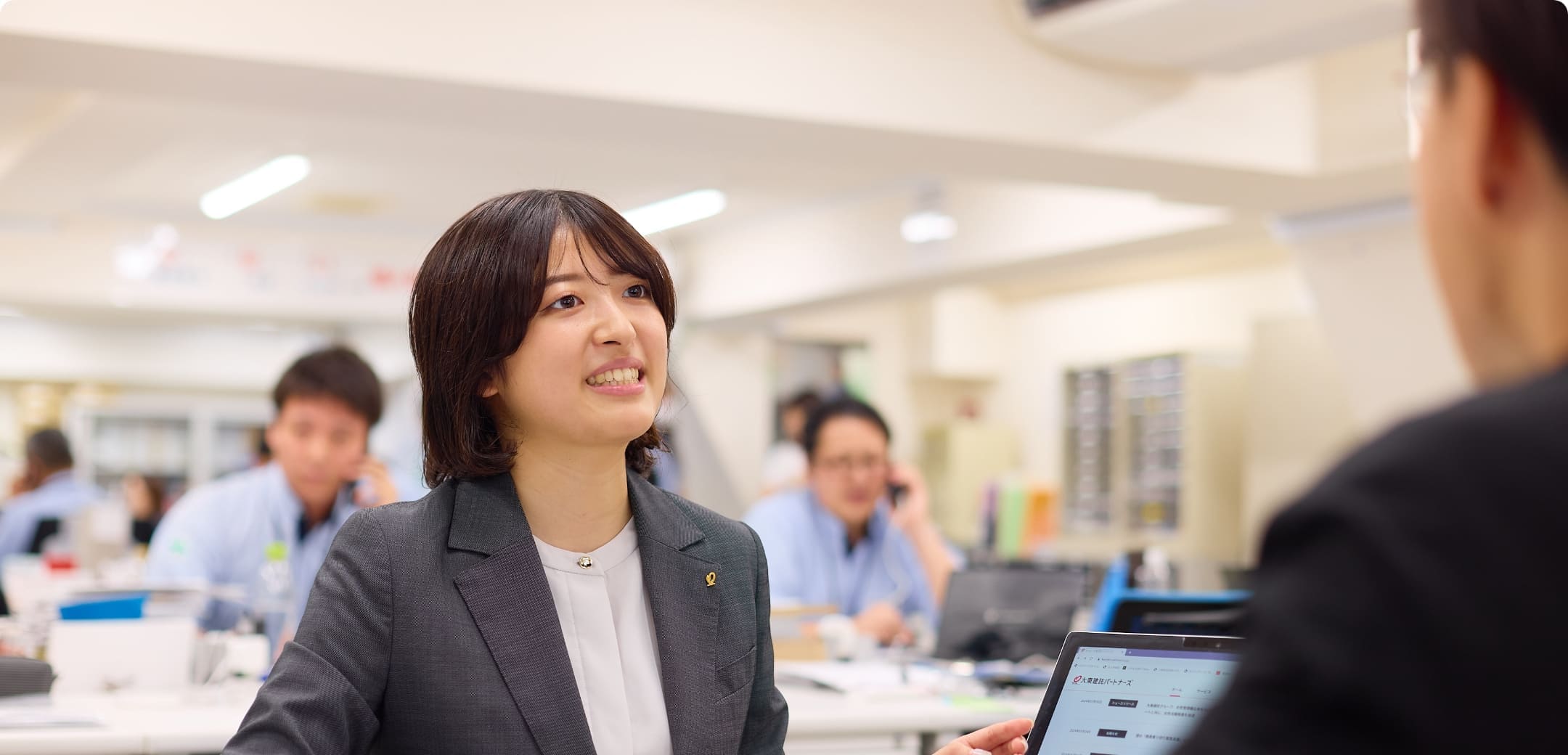 異動してくる前はコンサルタント営業職として、個人の土地オーナー様に向けて営業を行っていました。現在は法人のお客様に向けて営業を行うので、当時は競合だった企業に営業をしたり、ビジネスパートナーとして一緒に仕事を進めたりということもあり、ちょっと不思議な感覚ですね。不動産のプロを相手に仕事をしていくため、業界知識についてもワンランク上のものが求められるなど、大変ながらも刺激的な日々を送っています。